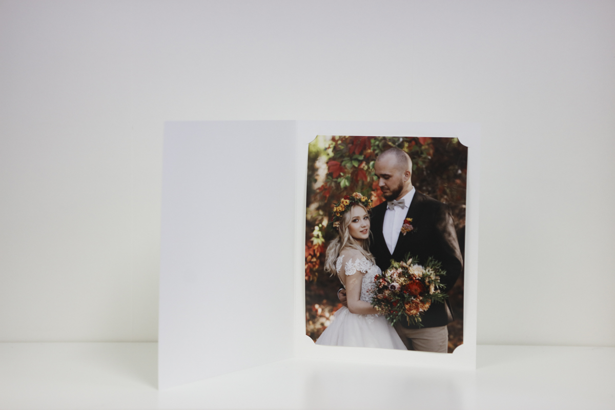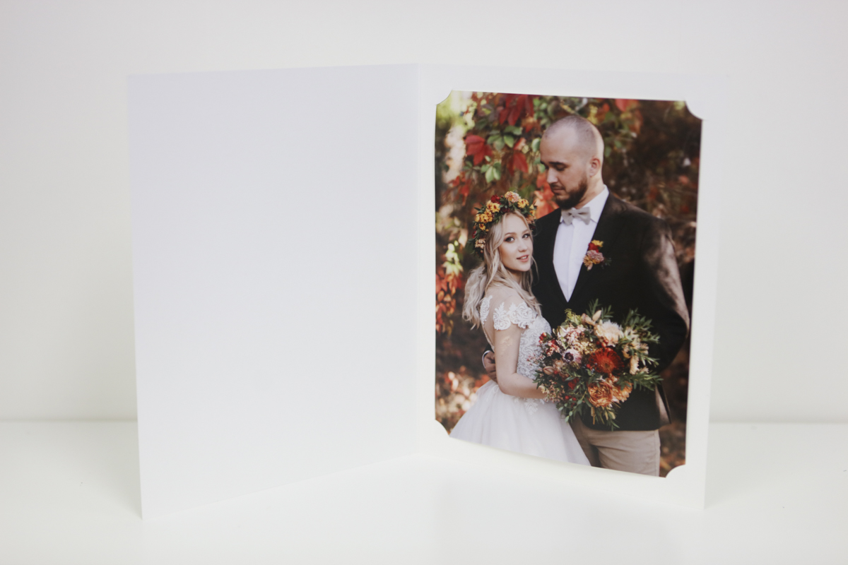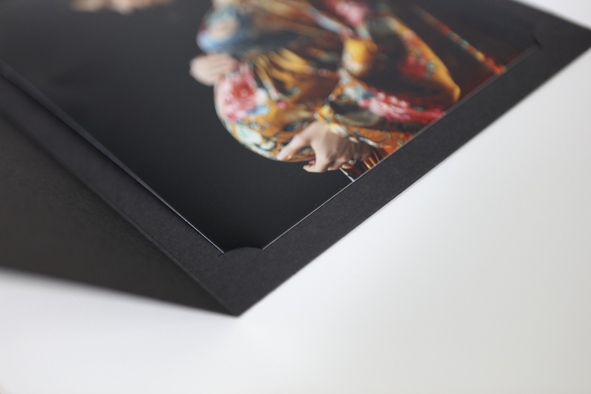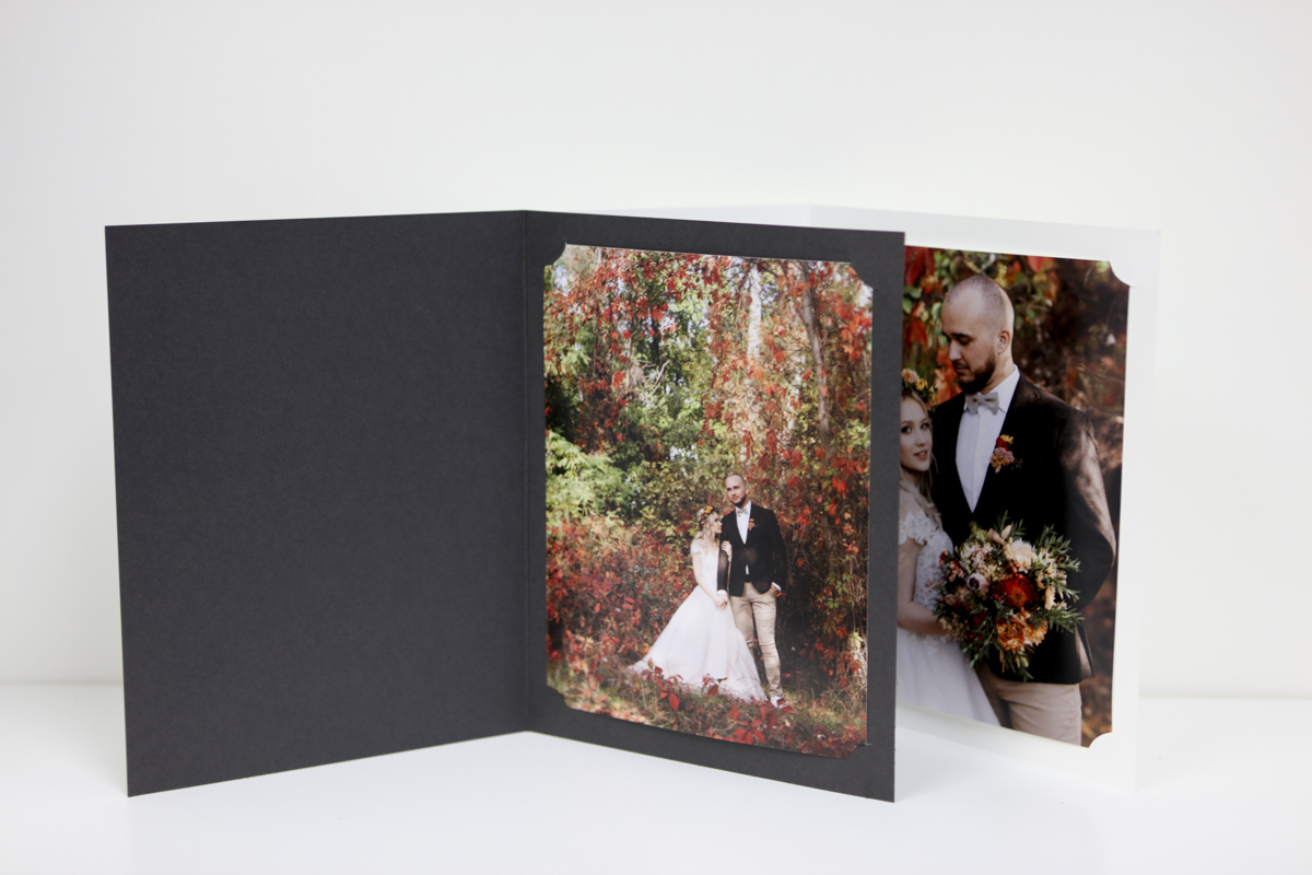 Our cut corner photo folders offer a simple, economical way to present photographic prints neatly and securely. Designed for photographers, these folders feature die-cut curved corners that allow the print to slide into place and be held securely without adhesives.